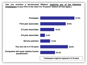 The trend for the use of the artificial intelligence in the legal world may be asserted by the graph shown below, where one shows the statistics of the answers to one of the questions posed in the survey made in March/April 2015 by Altman Well, Inc. directed to 797 “Managing Partners” of North-American firms (with over 50 lawyers) and answered by 320 0f them.