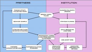 As for the “partners” entity, the cycle goes through their behavior in compliance with the philosophy and the consequent definition of the talent attraction and retention criteria. Those criteria make up the career plan of the professionals and define the evaluation criteria of the attorneys and partners (that is it! the partners must also have evaluation criteria). Finally, the definition of the remuneration method for the partners must be fully integrated with the entrepreneurial philosophy and all this together will then make up a single cycle of virtuous feedback, which will be vital for the long lasting of the institution and the financial happiness and professional achievement of the partners!
